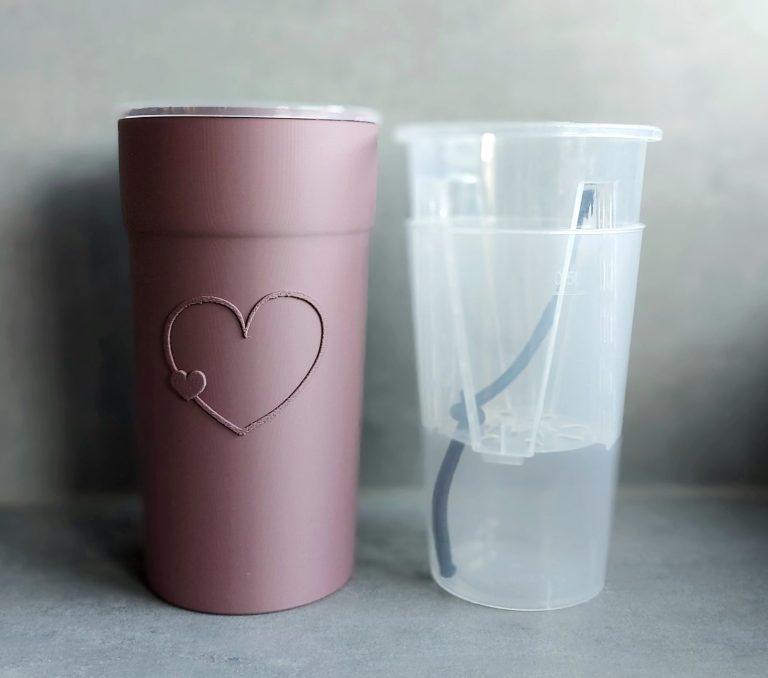 The combination of inner pot and water reservoir cup fits perfectly inside the 3D-printed cover, while ensuring good air circulation as the inner pot sits slightly elevated on the cover. The wicking rope delivers just the right amount of water to your plant.