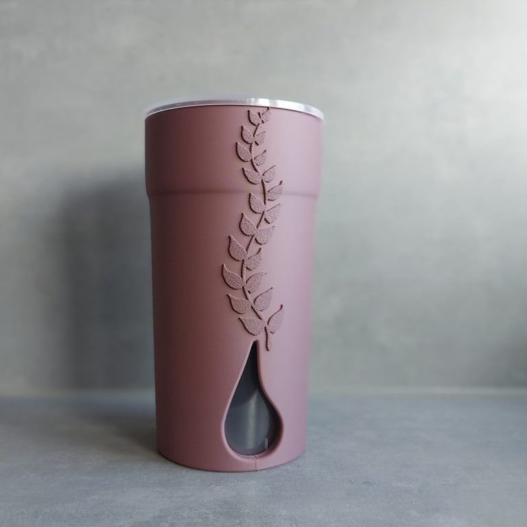 These recognizable elements include a water-drop shaped opening on the bottom side of the cover, topped by my hand-drawn swinging leaf-ribbon motive that extends to the top of the pot. At the bottom of the pot, you’ll find a heart-shaped element with a small opening.